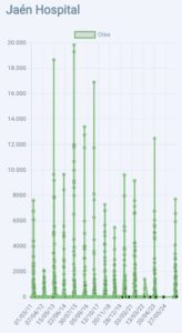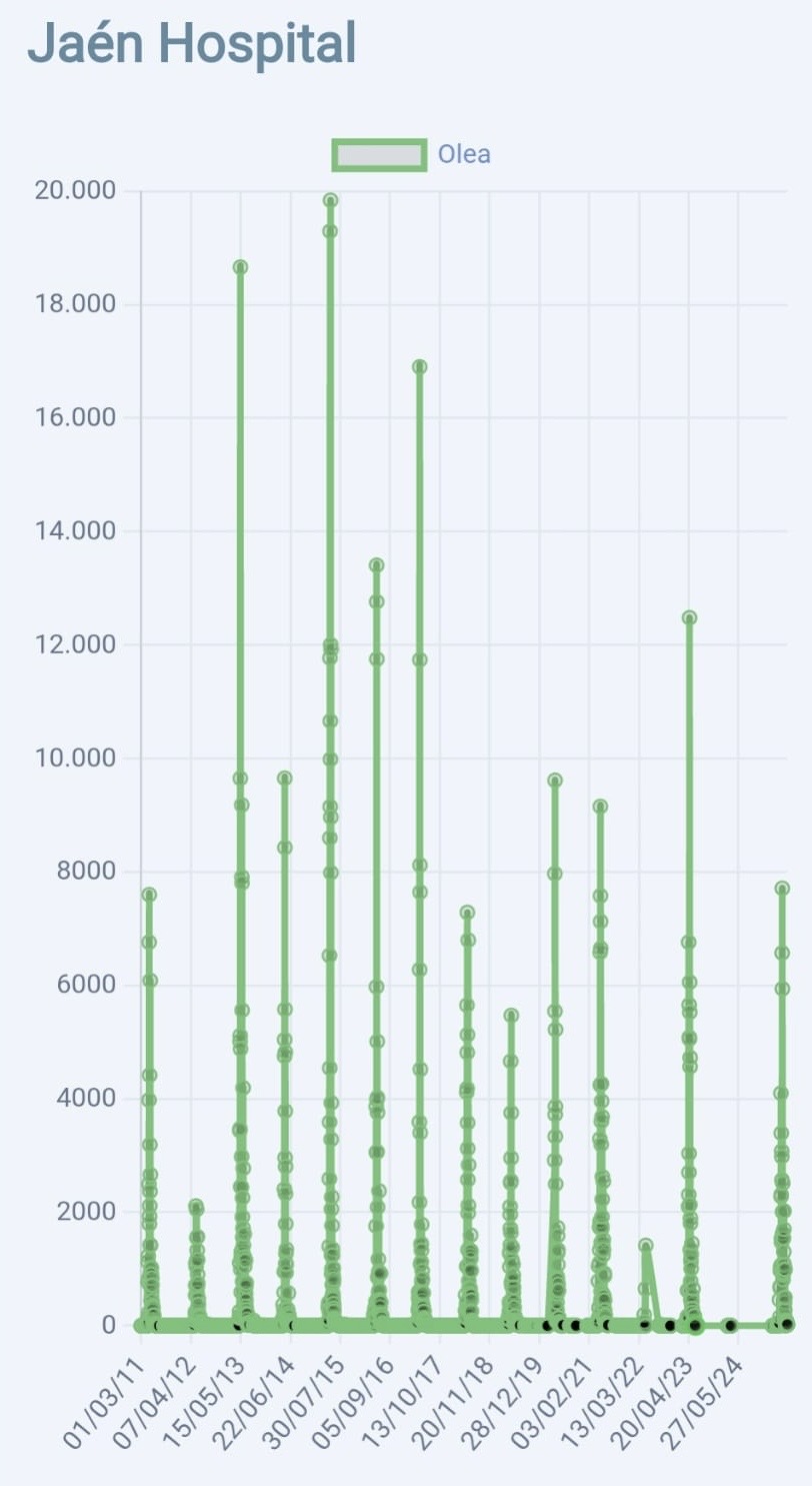 Jaén, mar de olivos, alcanzó el record histórico de conteo de polen de olivo diario en mayo del 2015 con 19.840 granos por metro cúbico de aire.