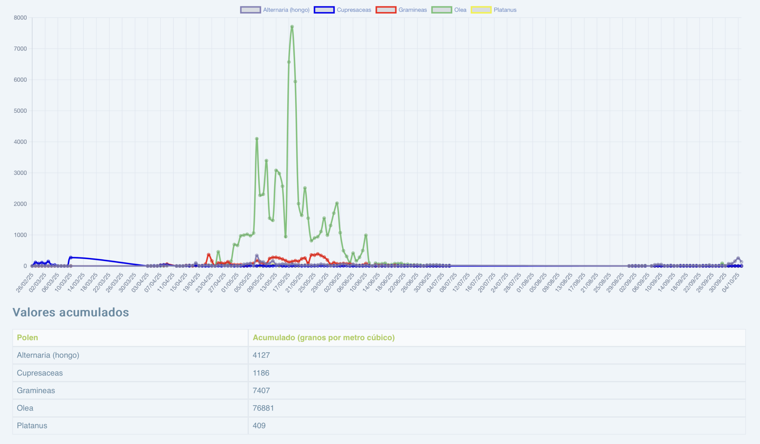 La Dra Cristina De Castro Gómez, alergóloga en el Hospital San Juan De Dios, así como actual secretaria del comité de Aerobiología, nos aporta los datos en www.pólenes.com desde 2019.
