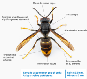 La Vespa velutina, conocida comúnmente como avispa asiática, es una especie invasora originaria del sudeste asiático. En los últimos años se ha extendido por diferentes regiones de la península ibérica (sobre todo la cornisa norte) y gran parte del territorio francés, que es por donde se cree que entró por primera vez. Se trata de un insecto de mayor tamaño que las avispas comunes en nuestro ámbito geográfico (Vespula vulgaris/Vespula germanica) e incluso más grande que el avispón europeo (Vespa crabro). La Vespa velutina, con un abdomen casi negro, presenta además una banda anaranjada y las puntas de las patas de color amarillo, lo que permite reconocerla más fácilmente.